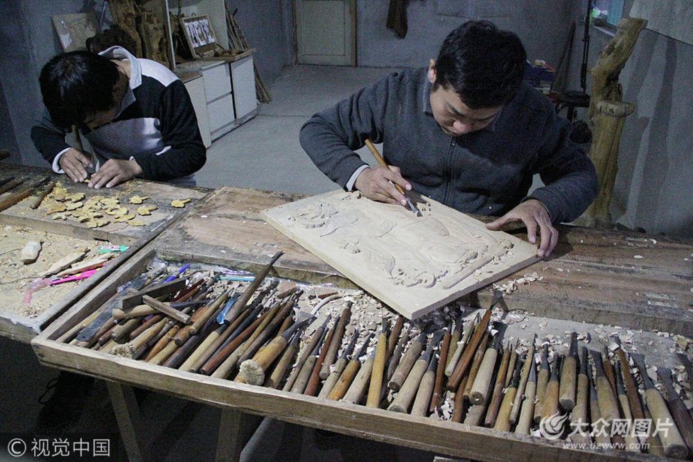 2017年10月26日,在山東濟南興隆街道辦事處礦村,一對聾啞的木雕兄弟由于技藝精湛,木雕活兒已經訂到排到了明年。