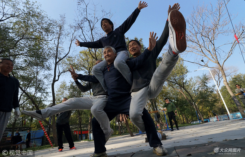 2017年11月4日,天津,四位老年人在玩身體“造型”。