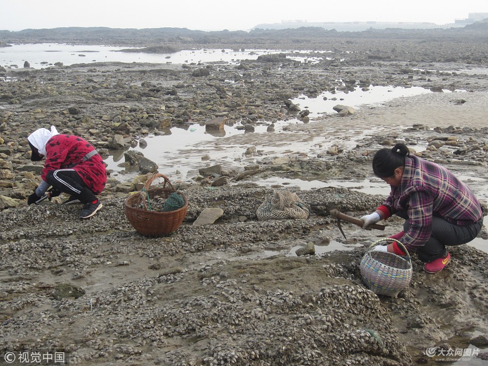 017年11月07日,農歷立冬,山東日照,山海天旅游度假區張家臺海濱,退潮后的礁石上附著大量個大味美的牡蠣。人們爭相鏟挖,不多時個個滿載而歸。正在挖牡蠣的人們。