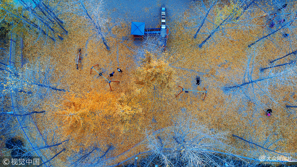 2017年11月18日,山東省濟南市,泉城迎來立冬之后首個寒潮天氣,最低氣溫降至-3.1℃,一夜寒風吹凈了空氣中的污染物,帶來了優質通透的藍天,讓樹葉落滿地。在森林公園,銀杏葉全部飄落,形成金黃色的地毯,夕陽西下時,滿園金黃如夢如幻。