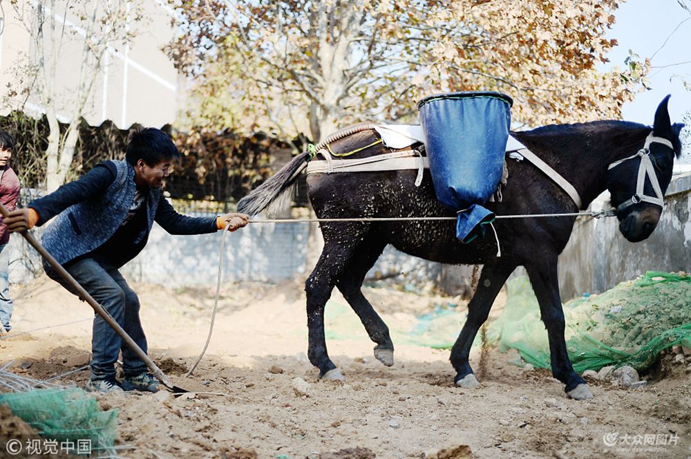 2017年11月21日,山東省濟(jì)南市,馬幫,是按民間約定俗成的方式組織起來(lái)的一群趕馬人及其騾馬隊(duì)的稱呼,是大西南地區(qū)特有的一種交通運(yùn)輸方式,它也是茶馬古道主要的運(yùn)載手段。而在市區(qū)的英雄山風(fēng)景區(qū)內(nèi),也活躍著這樣一支由30頭騾子組成的馬幫隊(duì)伍,只是運(yùn)輸?shù)奈锲芬呀?jīng)由茶葉、鹽巴等商品變?yōu)辄S土、水泥等建筑材料。