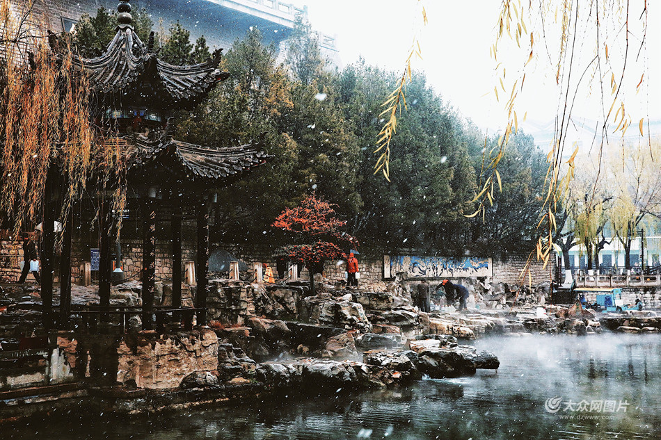 濟南迎來今冬首場降雪,黑虎泉、護城河水面上氤氳的水汽與天空飄落的白雪相映成趣,引游人駐足觀賞。大眾網記者 王濤 攝