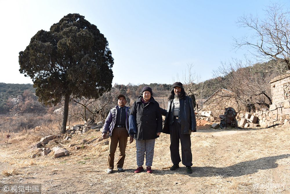 2017年12月16日,在山東省日照市嵐山區中樓鎮崔家峪村北的一座大山上,王京桂(音)和兩個兒子劉延靈(音,右)、劉延啟(音,左)在家門前一棵百年柏樹前合影。據劉延靈介紹,他們家世代在這座大山上居住,至今已經7代了。