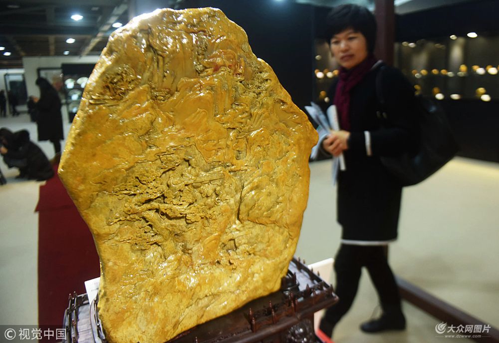2017年12月20日,杭州市民在觀看“千秋萬代”巨型田黃石雕。當日,一塊名為“千秋萬代”巨型田黃石雕亮相杭州某拍賣會,更是吸引了不少市民的關注。