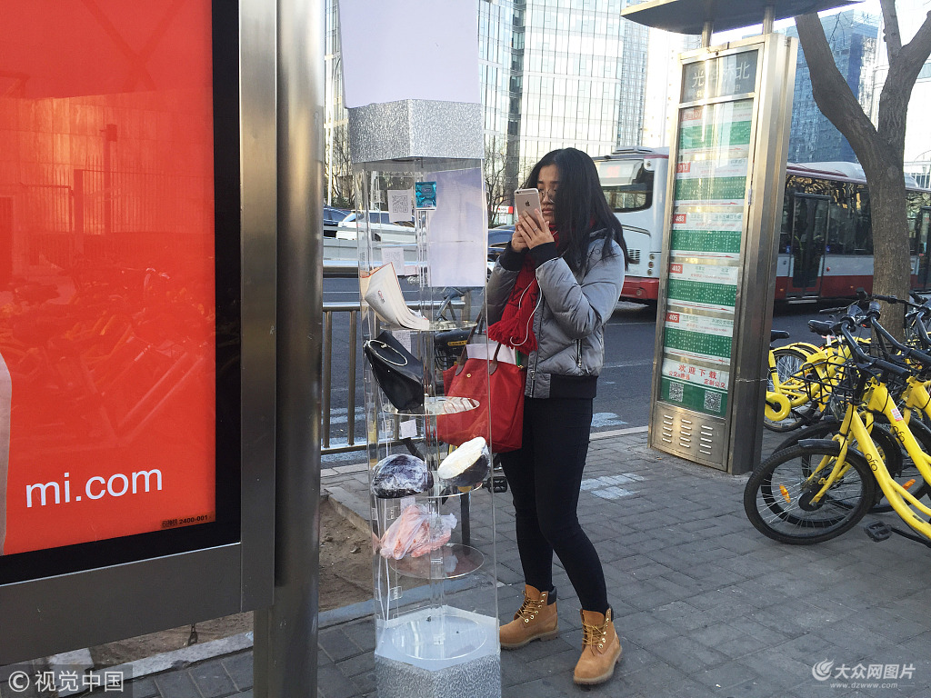 2017年12月21日,在北京一公交站牌前陳列著一圓形玻璃陳柜,簡直是生活型“共享大腦”啊,玻璃柜并不大共6個小格子柜,里面放著不同的共享物品。有蔬菜-茄子,胡蘿卜;有包包,還有書....