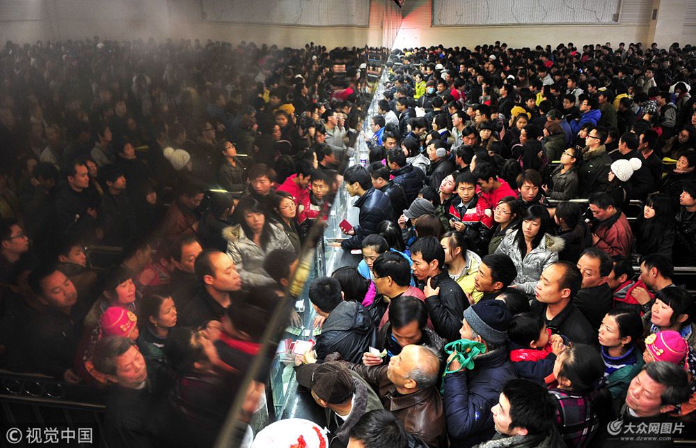 2011年12月28日,湖南省長沙市火車站售票大廳,前來買票的人們排起了長隊。當天是廣鐵春運火車票預(yù)售第一天,受互聯(lián)網(wǎng)售票、電話訂票和學(xué)生放假等因素的影響,湖南省長沙火車站迎來購票高峰,車站40個售票窗口全部開放。