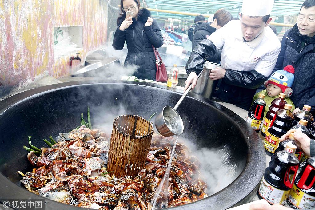 2018年1月6日,浙江湖州荻港“魚味”十足,剛踏進(jìn)古村大門,陣陣魚香味撲鼻而來。在荻港漁莊廣場上,高掛的魚干、香腸、臘肉等臘味,讓前來觀光的游客直吞口水。當(dāng)天的魚文化節(jié),吸引1萬人吃掉了2萬斤魚肉。圖為剛出鍋的魚肉豆腐湯受到市民的青睞。