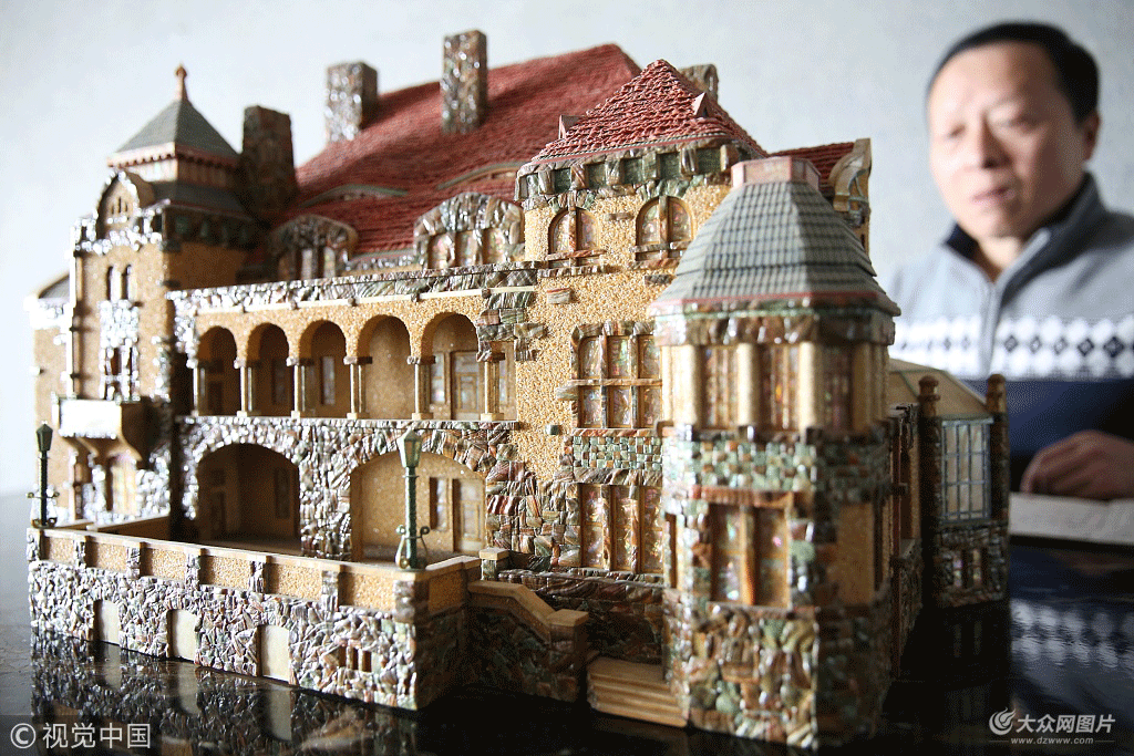 2018年1月14日,青島,對大多數(shù)人來說,散落在海邊沙灘上的貝殼并不會有太多的關注,但是在青島市民紀周統(tǒng)的眼中,這些小小的貝殼卻有著別樣的“生命”與色彩。他用了將近30年的時間,用貝殼蓋起了微縮版的青島老建筑,既向人們傳遞了環(huán)保的理念,又美化了生活。