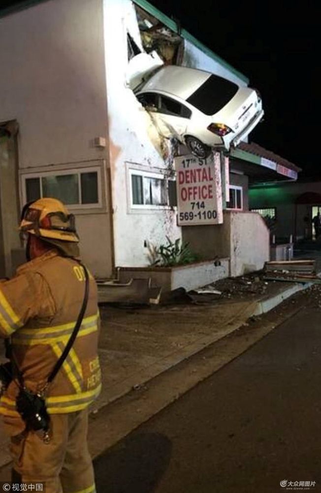 當地時間2018年1月14日,美國圣安娜,當地發生一起嚴重交通事故,一輛汽車撞入了當地移動房屋并被卡在了建筑物的二樓。