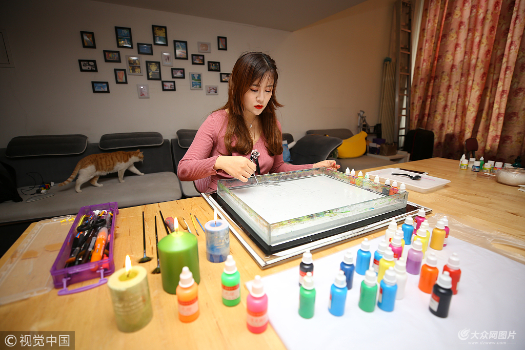 2018年1月17日,北京,接下來,梓涵會繼續從事水影畫培訓的課程以及相關衍生品的開發。“我希望給大家創造更多學習和體驗水影畫的機會,把這個小眾藝術推廣起來,讓更多人了解它。”圖為梓涵進行水影畫顏料研究工作。
