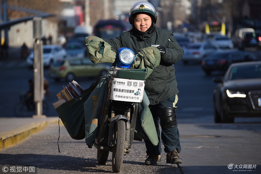 2018年1月9日,“三九”的第一天,濟南晴,-8℃~4℃,北風3級。5:30王明梅在濟鋼坐上最早的一班315路公交車,中間換乘K93路車,7:00剛過就到達了中國郵政集團公司濟南市分公司報刊發行局山師東路投遞部。作為一名投遞員,她第一件事情就是分揀報刊,大約9:00分揀完畢打包裝袋,騎上電動車,載著近100公斤重的報刊,開始一天的投遞工作。出了投遞部大門沿山師東路一路南行,到經十路再向東行3公里就到了王明梅的投遞區域。