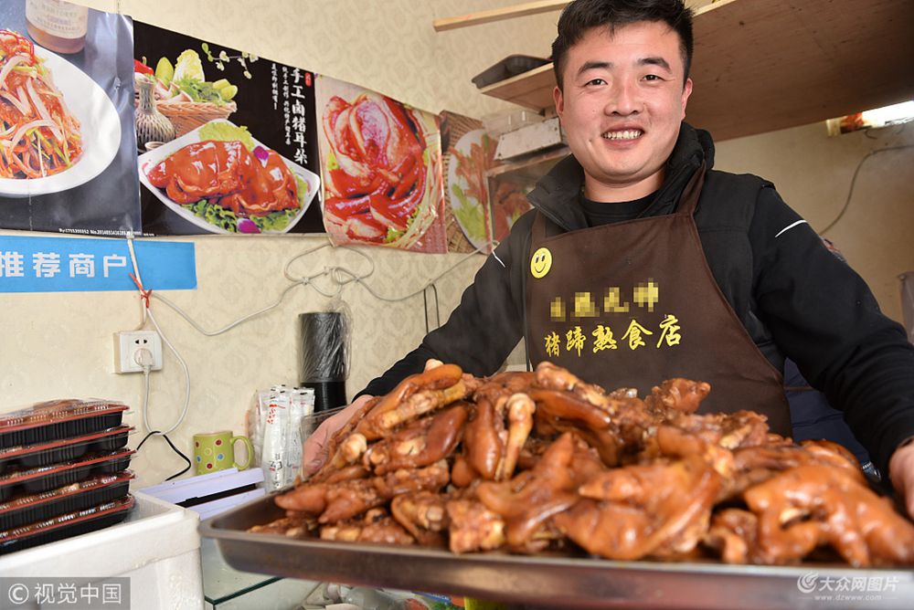 2018年1月21日,在山東省日照市文華街一個專賣豬蹄的小店里,今年26歲的王輝正在忙著制作豬蹄,他要趕在午飯前,將剛剛鹵制好的50個豬蹄送到客戶手中。通過賣秘制豬蹄和其它熟食,他每天能賣1000元左右。