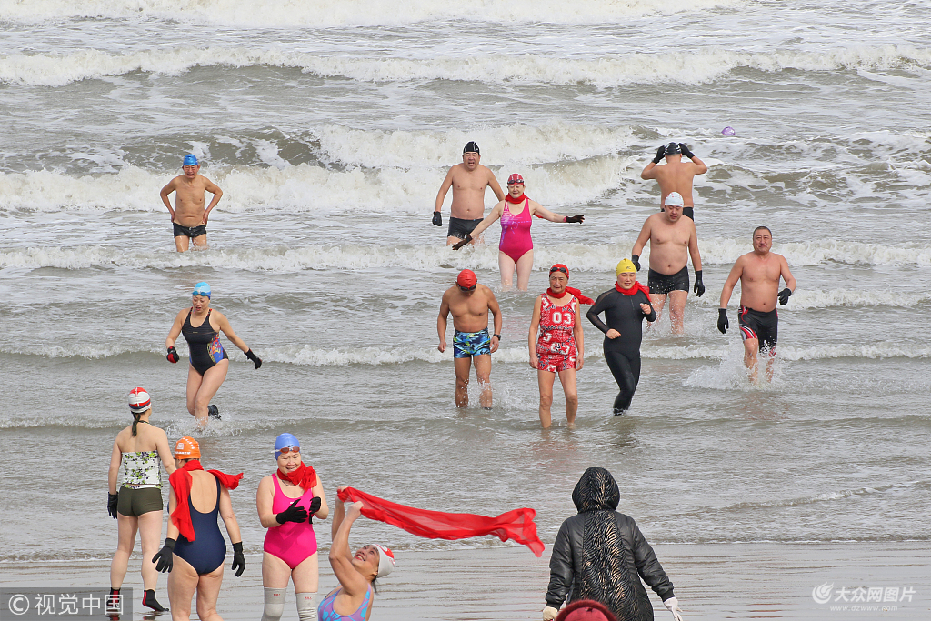 2018年1月26日,山東省煙臺市,一群中老年冬泳愛好者冒著零下10度的低溫下海冬泳,并在岸上玩雪,抗寒能力驚人。