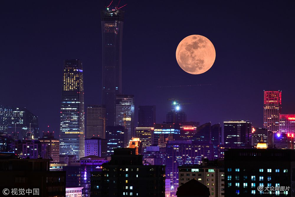 2018年01月31日。集超級月亮、藍月亮、月全食(血月)等天象的“超級藍血月”上演。據悉,這一天象近152年來首次出現。圖為2018年1月31日,北京,超級大月亮。(二次曝光)