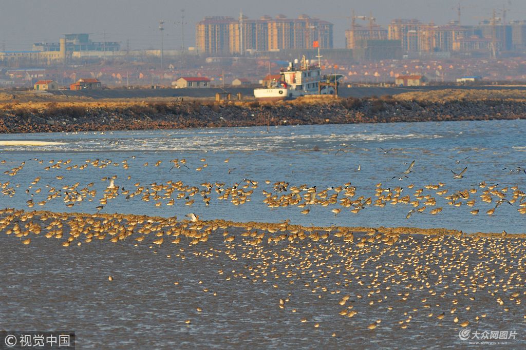 2018年2月1日,山東青島膠州灣濕地冰雪初融,大群候鳥在海冰退卻的灘涂上起舞鳴唱,巡游覓食,場面蔚為壯觀。