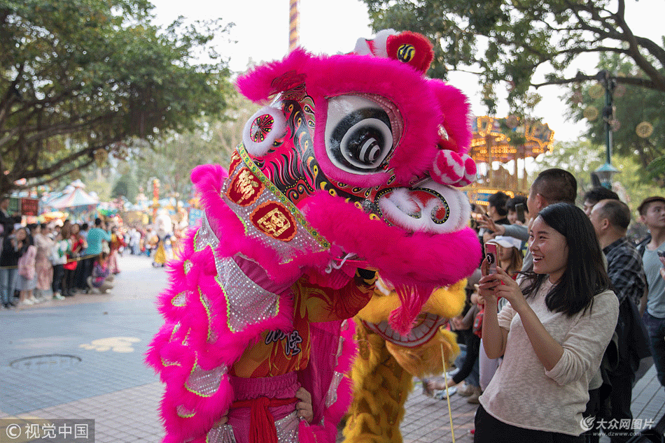 2018年2月16日農歷狗年初一,廣州長隆歡樂世界舉行歡樂大巡游。據悉,春節期間,園區舉行一系列新春主題活動,每天上演爵士舞、現代舞、旗袍傘舞、摩爾多瓦裙擺舞等各式舞蹈,以及舞獅、舞龍、陜西盤鼓、說唱、輪滑秀等數十個節目,一直持續到2月25日。 王華(廣東分社)/中新社/視覺中國
