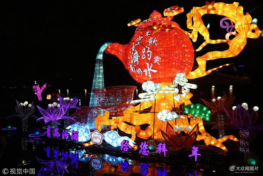 2018年2月17日,正月初二,濟南趵突泉公園內,不少游人在泉畔欣賞璀璨的花燈,并紛紛合影留念。
