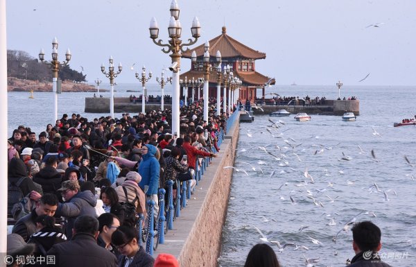 青島棧橋游人如織 海鷗相伴過新年