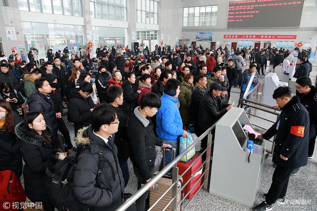 2018年2月20日,旅客在江蘇連云港贛榆汽車客運總站候車大廳內準備檢票乘車。