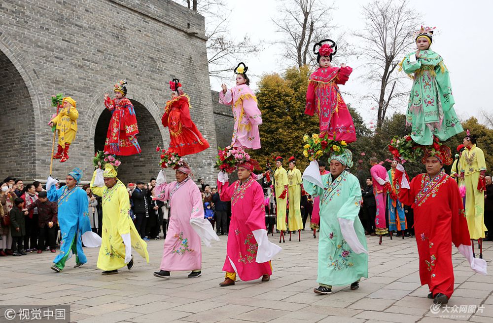 2018年2月25日,山東棗莊,當日是農歷正月初十,在位于京杭大運河畔的臺兒莊古城內,民間藝人向游客表演踩高蹺、舞龍、舞獅等豐富多彩的民俗文化節目,歡慶新春佳節。