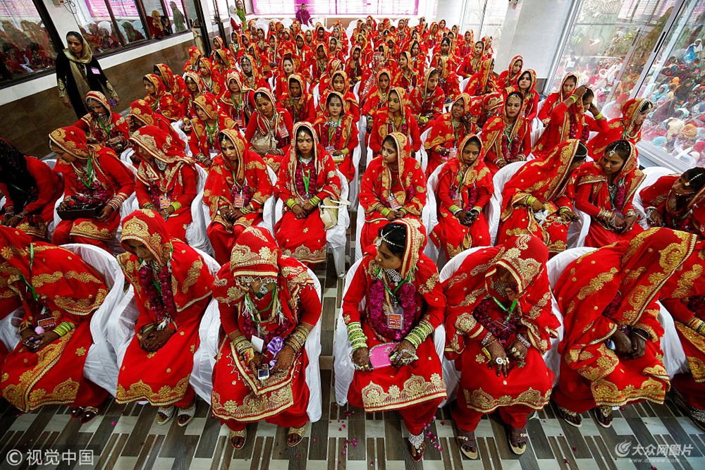 當(dāng)?shù)貢r間2018年3月4日,印度艾哈邁達(dá)巴德,約200對穆斯林夫妻舉行集體婚禮,新娘們正等待著婚禮宣誓儀式。