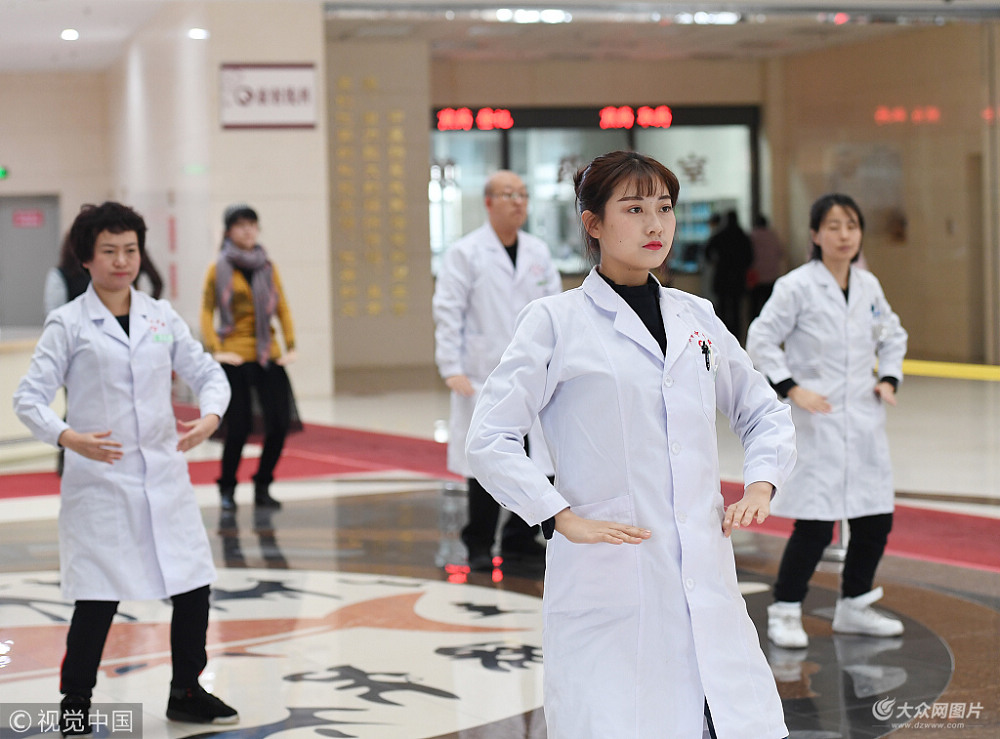 2018年3月15日,在長春市中醫(yī)院一樓大廳,30多名醫(yī)患跟隨護理人員練習八段錦。該院從三年前開始組建“日練三部曲”小隊,通過學習健康小錦囊、養(yǎng)生韻律操、氣功八段錦等,讓患者達到“內(nèi)外兼修 ”養(yǎng)生目標。 張瑤(吉林分社)/中新社/視覺中國