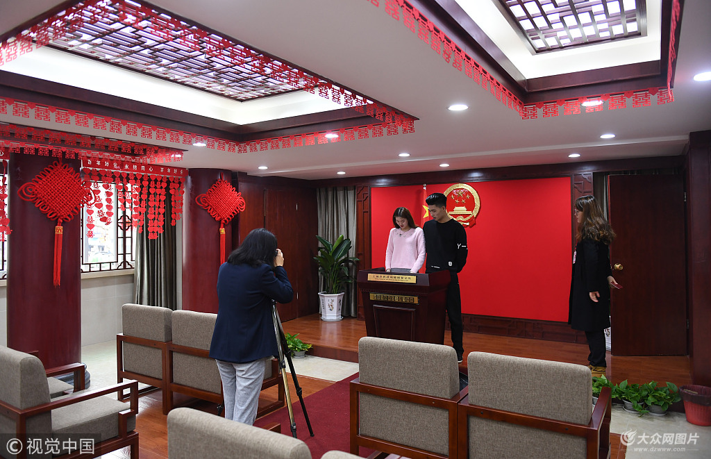 2018年3月19日,杭州,一對新人正在婚姻登記處共讀婚姻誓詞。近日,在浙江杭州,以“中國風”元素設計裝修的婚姻登記處亮相,紅色的基調以及中式的裝飾,不僅增添了喜慶氣氛,更展現了中國傳統文化。 王剛(浙江分社)/中新社/視覺中國