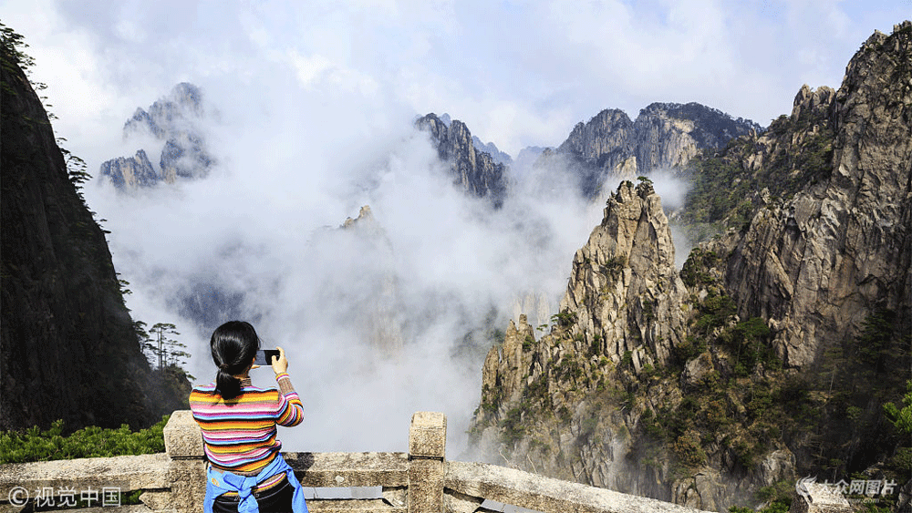 2018年3月26日,在黃山之巔拍攝的藍天青松和云海縹緲圖片。中國最聞名的風景名勝區(qū)——安徽的黃山風景區(qū),不僅因它山峰起伏、層巒疊嶂、怪石嶙峋的奇石妙景,更因它似真似幻、渺渺茫茫、神秘深邃的意境之美。
