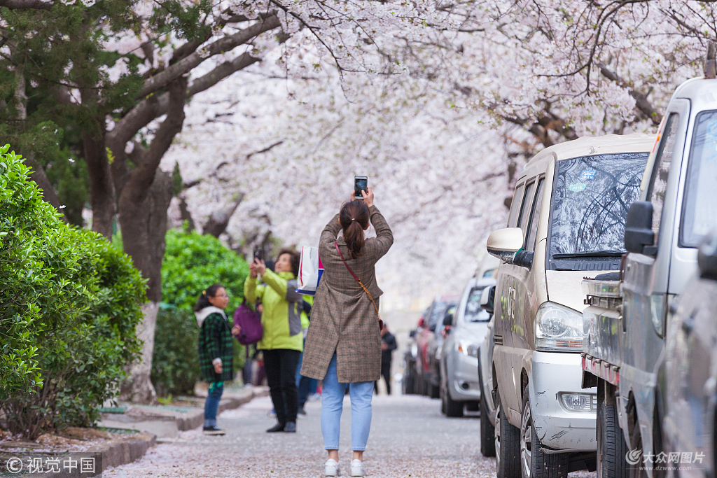 2018年4月14日,青島。三明南路因櫻花樹眾多聞名,被譽為“青島最美櫻花路”,每到櫻花季櫻花盛開都會吸引大量市民前來拍照留念。 圖片作者:劉小偉/視覺中國