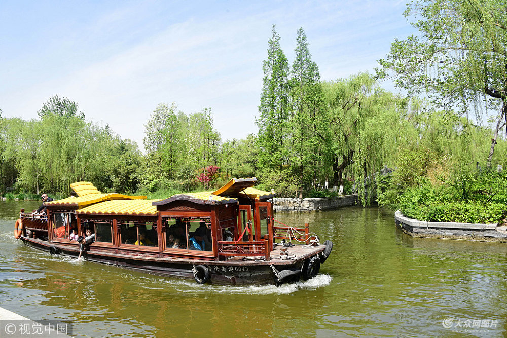 2018年4月15日,濟南,在旅游勝地大明湖,游人在春光燦爛的微風里乘船或漫步盡情游玩,翠綠的垂柳倒映在湖光里,春色把泉城這顆明珠裝扮的異常美麗,人們置身猶如人間仙境的畫面里,盡情享受著大自然饋贈的美麗畫卷。