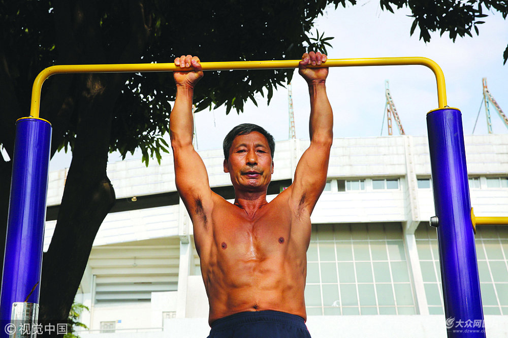 臧旭升,66歲,退休推拿師。11歲開始練業余體操,至今堅持55年。年輕時可一口氣在單杠上做90個360°大回環,退休后仍堅持至今。雖已年過花甲,卻仍能做出50個大回環。近幾年,中山有部分市民開始跟隨他鍛煉,大家習慣稱呼他“臧老師”或者“男神”。夢想把數十年鍛煉心得形成文字,傳授給更多人。