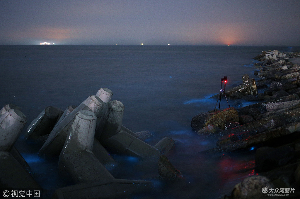 2018年5月21日凌晨,山東東營孤東海堤部分區域現熒光海灘,海水中閃現著夢幻藍光,如同星辰墜入大海一般,十分美麗。