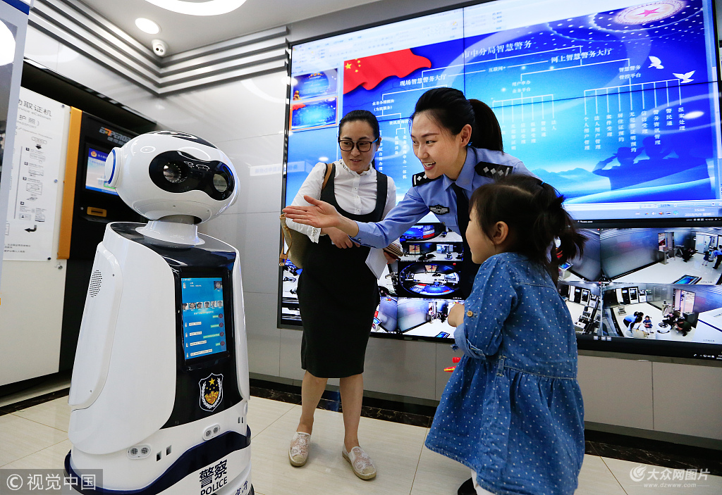 2018年5月9日,濟南,智慧警局大廳內的機器人“小智”吸引了群眾的目光。圖為民警正在給一位小朋友講解“小智”的使用方法。