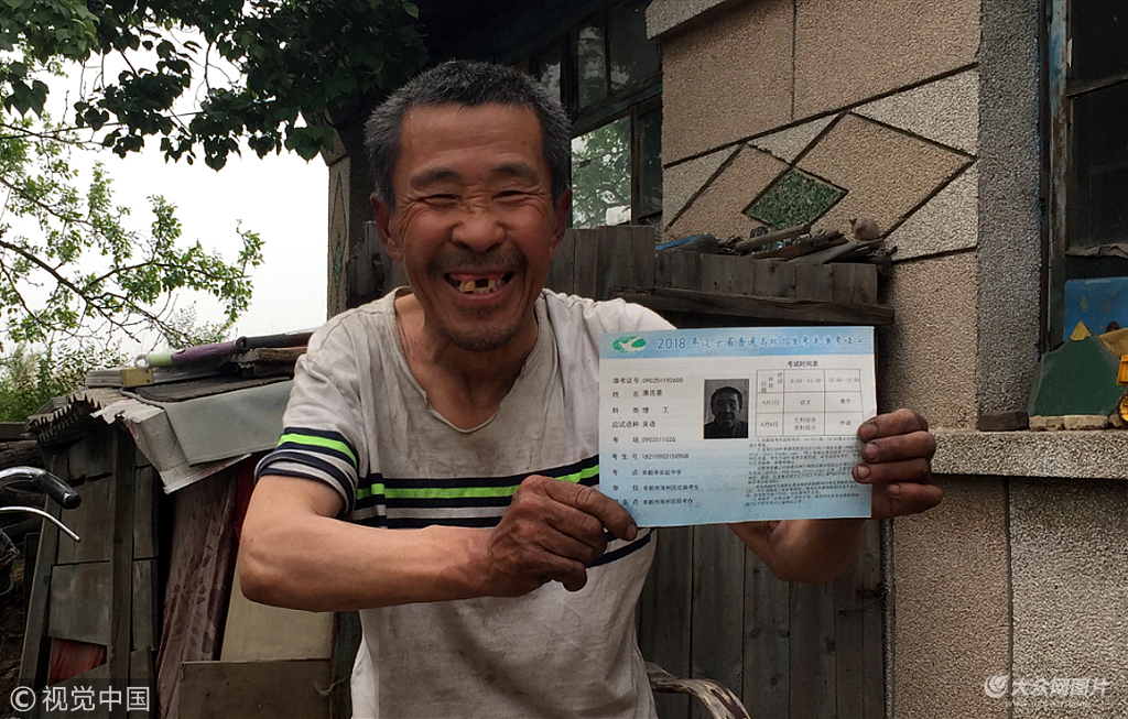 2018年6月5日,沈陽,康連喜,這個生長在遼寧省阜新市韓家店西瓦村的一位普通農(nóng)民,因每年參加高考而被許多人而熟知。對于康連喜來說,一年一度的高考就像他人生的一個舞臺,只有在每年的這幾天里他才能躍入大眾的視線中。對于即將迎來的第18次高考,他仍樂此不疲,領(lǐng)到準考證后的他難掩喜悅之情。