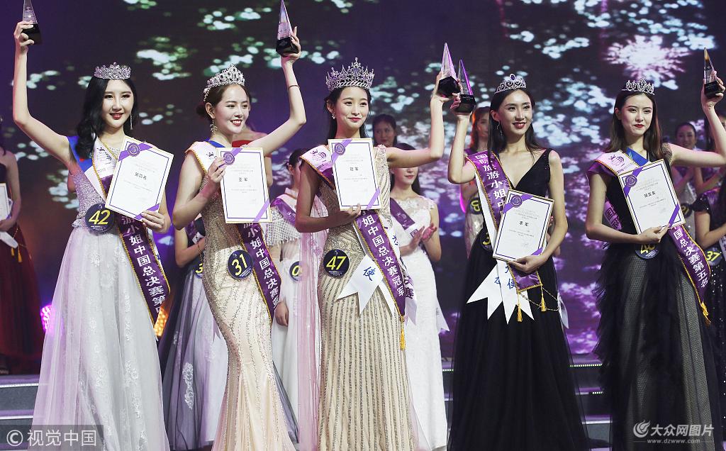 2018年6月10日晚,2018國際旅游小姐大賽中國總決賽在江蘇無錫舉行,來自遼寧、上海、江蘇、福建、浙江、山東等地的53位佳麗參加大賽角逐。通過現場休閑裝、泳裝、晚裝以及知識問答等賽事環節的比賽,最后來自浙江賽區的馮家慧獲得冠軍、湖北賽區胡怡靈獲得亞軍,江蘇賽區姚嵐獲得季軍,福建賽區劉嘉怡、遼寧賽區鞏澳分別獲得大賽第4、5名。圖為頒獎儀式現場。 錢興強(攝影部)/中新社/視覺中國