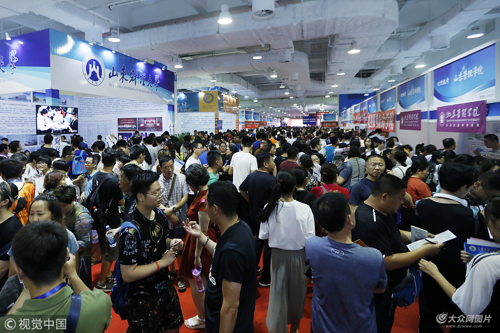 2018年6月25日,2018山東高考咨詢會在濟南市高新國際會展中心舉辦,有不少家長前來為孩子咨詢各大高校招生事宜。現場人潮涌動,堪比濟南著名景點芙容街。圖片作者:時陌/視覺中國