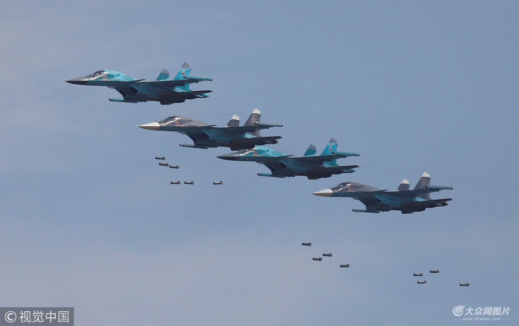 當(dāng)?shù)貢r(shí)間2018年8月4日,俄羅斯梁贊,2018“航空飛鏢”(Aviadarts)國際軍事比賽即將開幕,特技飛行隊(duì)在彩排。圖片作者:MAXIM SHEMETOV/視覺中國
