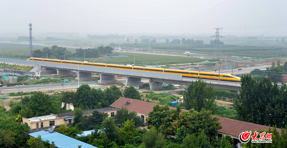 2018年8月9日上午10時許,一列車身噴涂黃色標識的動檢列車駛過濟青高鐵淄博豬龍河橋、西五路跨線橋。列車飛馳而過,宛如一條黃龍,行駛在綠毯上,薄霧中掠出印記,駛向濟南方向。