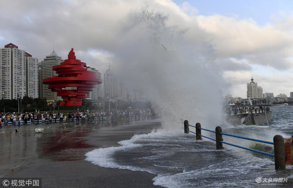 青島受臺風“摩羯”影響 海邊巨浪拍岸