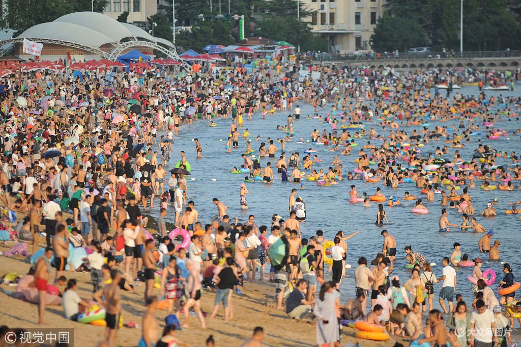 2018年8月16日,臺風過后山東青島高溫酷暑持續(xù),據(jù)天氣網(wǎng)信息,當日最高溫度達34℃,海灘游客密集,洗海澡成“避暑游”第一選項,每天數(shù)十萬人涌入各大海水浴場享受夏日清涼。