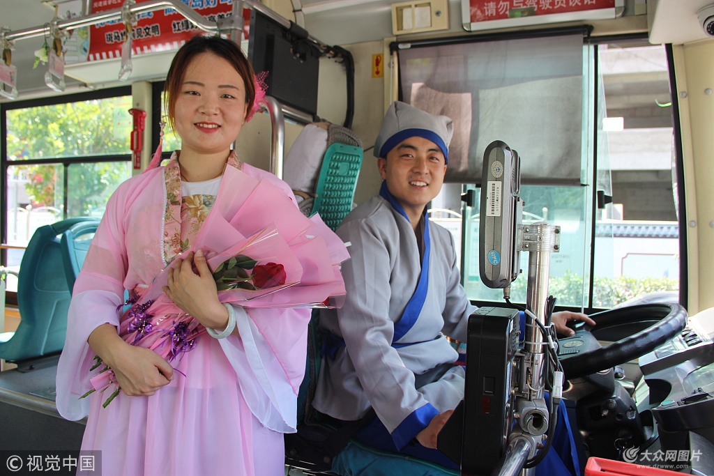 2018年8月16日,在交運集團青島溫馨巴士一輛613路車上,駕駛員劉順與其妻子王琳琳變裝“牛郎織女”為車上乘客送上玫瑰花。同時,車廂還被打造成七夕表白專列,設(shè)立“七夕故事”、“脫單漂流瓶”、“表白墻”、“招桃花專座”等多個板塊,鼓勵平時羞于表達的乘客大膽說“愛”。江敏/視覺中國