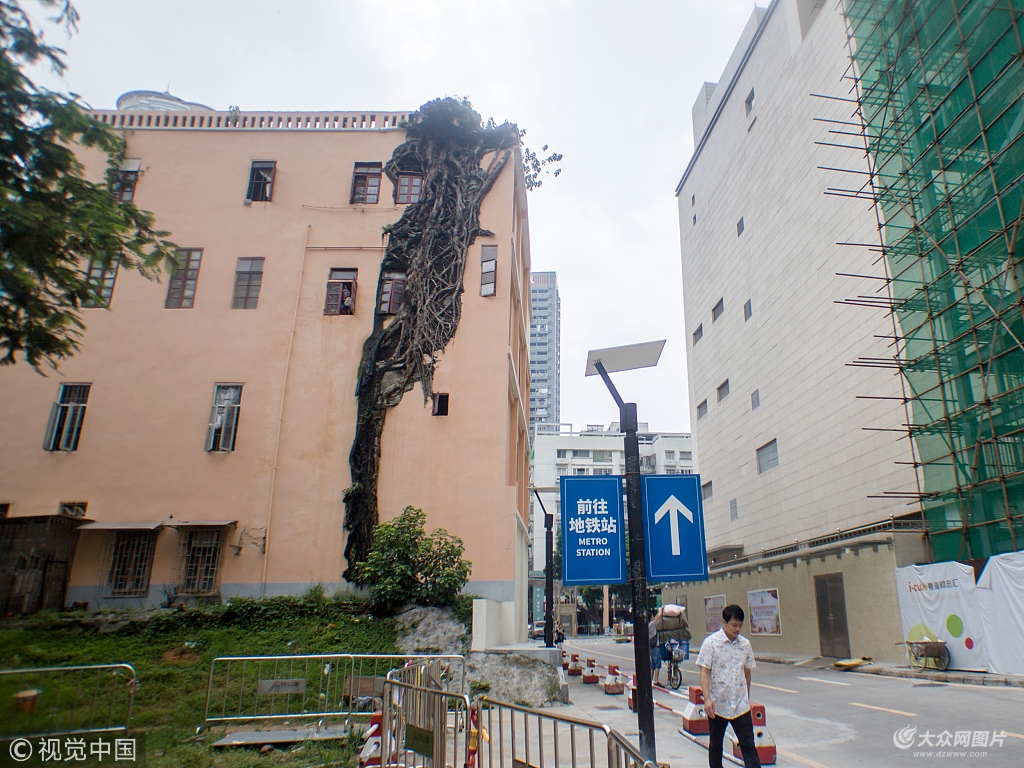 2018年8月23日,廣州越秀區繁華的北京路附近,有一處奇特景觀:一株榕樹在一棟居民樓的墻內倔強生長,樹干“穿墻透窗”而出,裸露一半樹身在外,整棵樹長得比樓房還高。適逢廣州召開《房屋使用安全管理規定(草案)》立法聽證會,近日來到這處“樹墻”居民樓內進行了探訪,樓內仍有人正常居住。