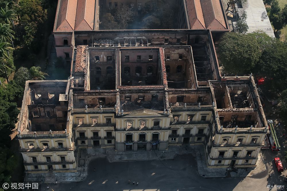 9月4日報道,當地時間9月3日,巴西里約,巴西國家博物館。里約熱內盧擁有200年歷史的巴西國家博物館9月2日晚發生火災。圖為航拍大火后的巴西國家博物館,據圖片顯示博物館已被燒成空架。