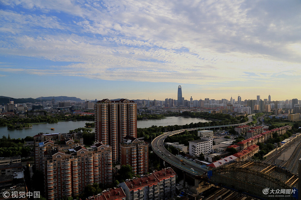 2018年9月4日傍晚,山東濟南,夕陽連天際,邊色滿秋空。夕陽斜照,蔚藍的天空浮動云朵,他們在夕陽映照下呈現出火焰般的胭紅色,與大明湖相互映襯如一幅畫卷呈現在濟南市民眼前。