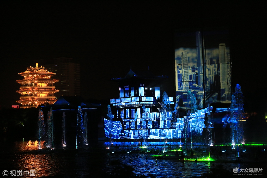 2018年9月11日,山東濟南,大明湖上開啟“明湖秀”燈光表演,現場燈光璀璨、絢麗多彩,引市民游客沉醉其中。