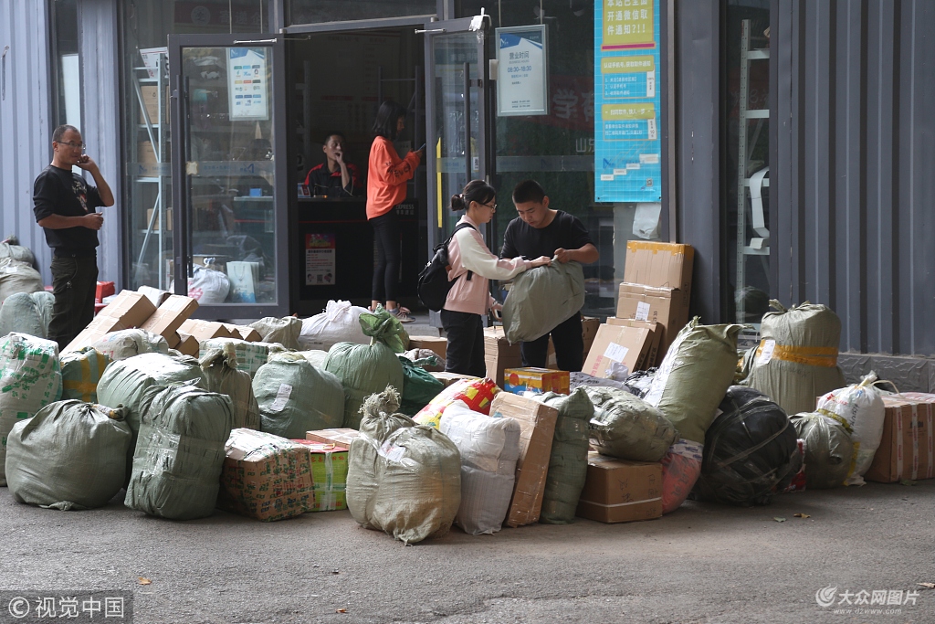 2018年10月7日,山東濟南,國慶小長假今日結束學生陸續返回校園,在文化東路一高校校園見到快遞爆倉,眾多學生回來第一件事就是取快遞件。