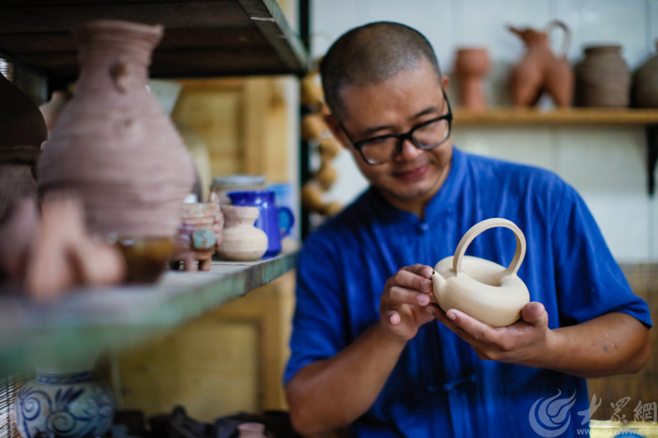 濟南市陶瓷藝術大師谷善龍正在欣賞自己的作品圓融壺 大眾網記者 畢勝