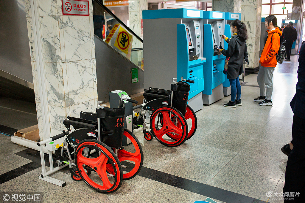 2018年11月4日,濟南,在山東省中醫院看到,一樓大廳樓梯旁,有橙紅色輪轂的共享輪椅擺放在那里,供病人使用。