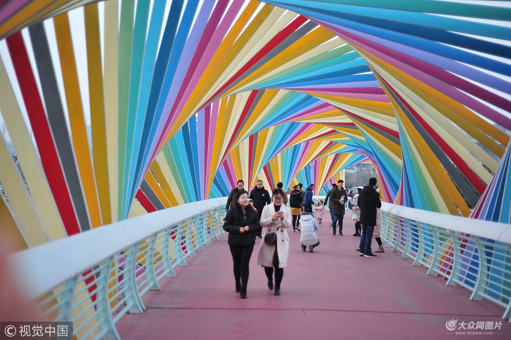 2018年12月16日,山東青島,唐島灣公園,摩天輪下的“七彩橋”,色彩絢麗的橋身五顏六色,從哪一頭看,都像一道道彩虹飄落在海上,粉紅色的橋面則像新鋪的紅地毯,與摩天輪構成青島西海岸又一道靚麗的風景,吸引大量游客前來拍照。