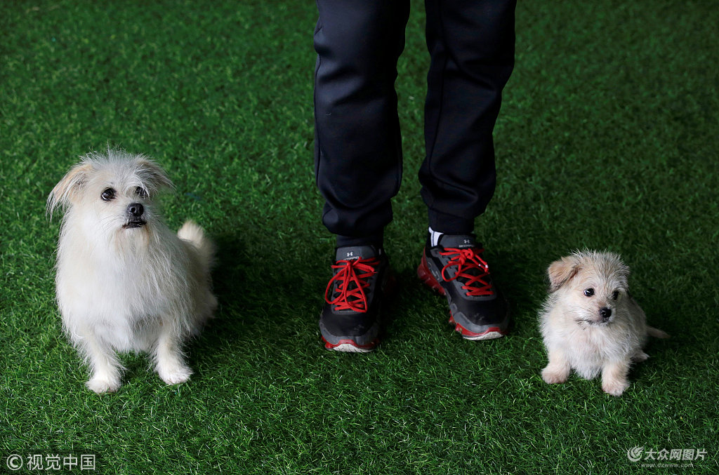 北京,九歲的寵物狗“果汁”以及兩個月大“果汁”克隆體“汁汁”。